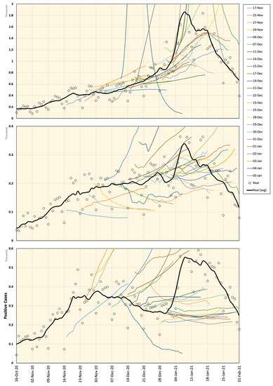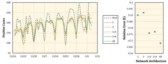 The network architecture was implemented with LSTM cells (each output vectors of size 300 elements) using Wolfram Mathematica (R) ver. 12.1 on a workstation with four Intel (R) Xeon CPUs running at 3.60 GHz, with 128 GB of memory and three NVIDIA GeForce 1080 GPUs. The FC layer was set as three linear layers of 600, 300, and 100 neurons each. The training was conducted using time frames of seven days (, ) with the ADAM optimizer and cross-entropy loss function. For each data sample, all available data starting from 26 January 2020, up to one day earlier, were used for training for 2000 epochs and with a batch size of 32. The testing phase was repeated to estimate a set of future days as follows: