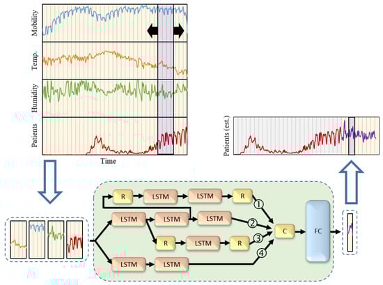 The principal idea of the proposed framework is the high correlation between the public mobility estimate and potential increase of SARS-CoV-2 infections. Crowded regions would lead to high probabilities of viral transmission [38,39]. Moreover, we believe that changes in meteorological factors have some useful insights that may improve forecasting results. The proposed framework is based on the LSTM neural network architecture [26]. A deep learning architecture with LSTM layers has proven to be an efficient design for time series data manipulation and regression. We consider a novel multi-path design in which data pass through different data processing pipelines for better feature extraction. The data extracted from all paths are then processed within an FC layer to estimate future positive cases. The training dataset was designed as a set of time-sampled values over k days with values of mobility, maximum temperature, average humidity and reported COVID-19 positive cases. These features were selected from our previous studies as the dominant factors correlated with COVID-19 positive cases. However, the extension to include other factors is simple and direct. The data mapping is formulated as follows: