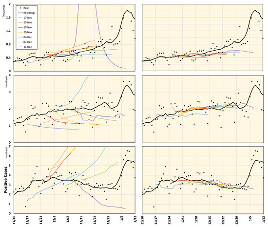 Google Cloud forecasting of DPC in Tokyo (top), Aichi (middle), and Osaka (bottom). Different versions are labeled with the forecasting start date and compared to the real values recorded from 26 October 2020 to 25 January 2021. All curves represent a 7-day average value.