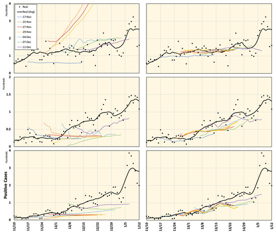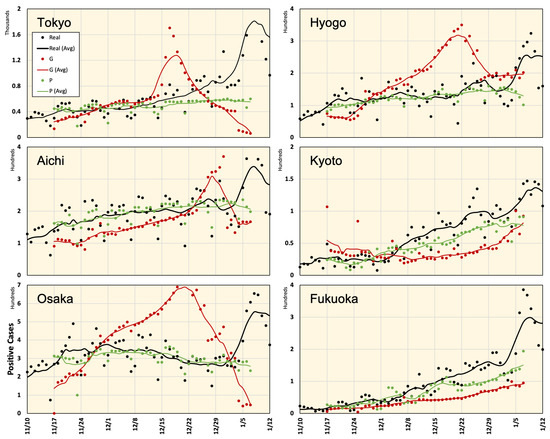 The prefectures of Tokyo, Aichi, Osaka, Hyogo, Kyoto, and Fukuoka in Japan were considered in this study. The prediction results for these regions are shown in Figure 6 and Figure 7. As seen from these figures, Google Cloud forecasting with different time slots is highly inconsistent. However, the results of the proposed model were in good agreement with the actual values. Average estimated values from 16 November 2020 to 7 January 2021 using different methods are shown in Figure 8). One can observe that the forecasting data around the right-side peripheral in Figure 6 and Figure 7 are of low quality. With relatively long-term forecasting, error accumulation around the peripheral region is expected to be higher than that close to known data. In addition, this period demonstrated that end-of-year and new-year vacations occurred when special mobility activities occurred. In addition, the number of PCR tests reduced because most hospitals were closed from 28 December to 3 January suggesting that the number of new positive cases might have been reported in the week of 4 January 2021. Moreover, we believe that the proposed framework demonstrated a low-quality result during this period because there was no relevant history regarding this special season in the training dataset.