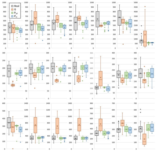 Boxplots demonstrate real (R) and estimated positive cases using Google Cloud forecast (G) and the proposed framework (mobility + meteorological factors) (P) and mobility only (P) for Tokyo (top), Aichi (middle), and Osaka (bottom). Plots represent seven time periods in chronological order from left to right.