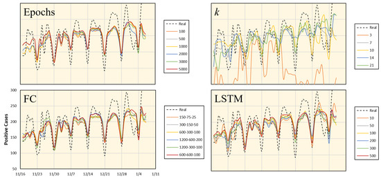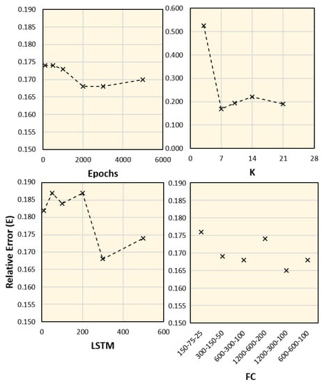 An additional study was conducted to test the robustness of the proposed framework for different parameter setups, including variations in training epochs, k, and the sizes of the LSTM and FC layers. We considered data from Aichi, and the average values of the corresponding days were computed from the seven time periods. The results with different parameter setups and the corresponding error values are shown in Figure 10 and Figure 11, respectively. These results indicate that the most dominant parameter is the k value, which should be carefully adjusted. Moreover, an ablation study was conducted by customizing the network architecture. The number of network tracks (labeled from 1 to 4 in Figure 4) is reduced to only one or two tracks, as shown in Figure 12. It is clear from the figure that the full network performs better than the sub-networks; however, the error difference is marginal.