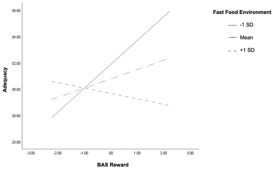 Previous research has found positive correlations between the density of fast-food outlets and poor dietary patterns, which is alarming given the recent dramatic global increase in fast food restaurants [23]. To examine whether certain adolescents may be more impacted by dense fast-food environments, the current study investigated the interactions among reward sensitivity and fast-food environment in relation to diet quality in early adolescents. We hypothesized that early adolescents with higher reward sensitivity living in more dense fast-food environments would have poorer diet quality. We found no main effects or interactions between BAS drive or reward and HEI total score or moderation, yet there was an interaction between reward sensitivity and fast-food environment in relation to adequacy. Specifically, higher reward sensitivity was associated with better diet quality among adolescents living in less dense fast-food environments.