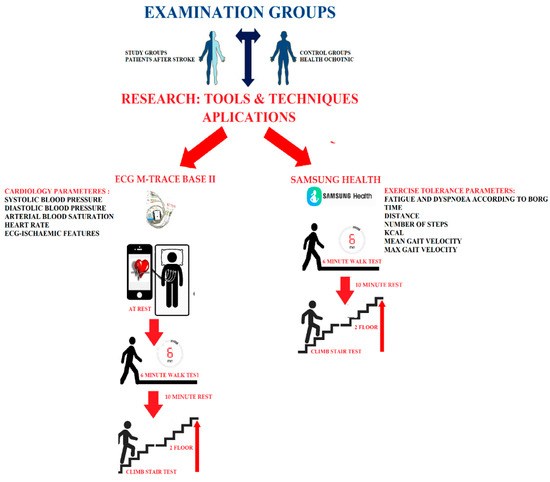 In the design of this study, two research groups were created consisting of a post-stroke group and a control group without a stroke. All participants were tested in the same way. Each group first performed a trial SMWT and SCT. The next day, SMWT and SCT were performed again, the results of which are presented in our article. In the study we used the mobile ECG M-Trace Base II and Samsung Health applications. With the Samsung Health application, exercise tolerance parameters such as time of test performance, the walked distance and steps made, as well as the mean gait velocity and maximum gait velocity and burned calories were assessed. Additionally, after the tests performed, the level of dyspnea and fatigue was assessed according to the modified Borg scale. The evaluation of these parameters was performed after SMTW and SCT. Using the ECG M-Trace Base II application, cardiological parameters such as ECG and HR (heart rate) were assessed. In the assessment of cardiological parameters, the blood pressure monitor was additionally used to measure the systolic (SBP) and diastolic blood pressure (DBP) as well as the pulse oximeter to measure the saturation of arterial blood with oxygen. The evaluation of these parameters was performed at rest, after SMTW and after SCT. The design of this study is shown in Figure 1.