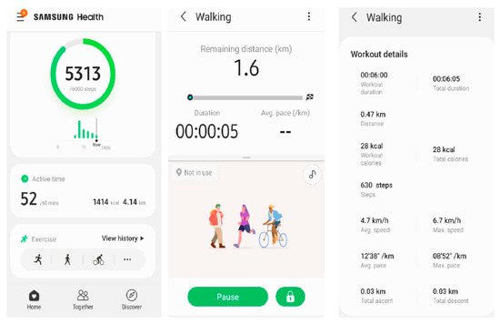 Samsung smartphones were the first to have the Health application enabling tracking the measurements associated with physical activity. It was the first free application available for all the Android users. Since 2 October 2017, this application has been available for iPhones with iOS 9.0 (Apple Inc., Cupertino, CA, USA) operating system [23]. Samsung Health is an accurate tool that serves to, among others, count the steps in various age groups and regardless the gait pace, even during slow walking. As it has been proved in the studies by Johnson et al. [24], Samsung Health is the most accurate application in detecting steps and energy expenditure during a self-selected walking pace. This application provides information on the walked distance, mean and maximum gait velocity, the number of steps, and the number of calories burned. Moreover, thanks to the additional equipment, it enables monitoring heart rate and arterial blood saturation. In addition, the application contains, among others, the modules for monitoring body mass, sleep, water use, and caffeine consumption.