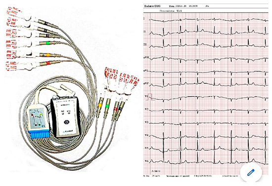 ECG M-Trace Base II application is a software designed to record and assess the ECG recordings in mobile phones with Android operating system. In order to record the ECG results, the application requires the M-Trace recorder which is sold together with the software. The M-Trace Base II (c) recorder was developed according to the requirements of the 93/42/EEC directive and PN-EN 62304 standard, which determines the guidelines on designing and development of medical systems. The M-Trace recorder has compact design, small size, and internal power supply. It communicates with smartphone via wireless Bluetooth standard connection. In connection with the application, the ECG M-Trace Base II recorder (Figure 3) is a device intended for full ECG recording in 12 standard leads [25]. After connecting the electrodes, the device sends a signal to the smartphone application, where it is possible to read and interpret the ECG record.