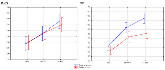 In the post-stroke group, in the compared ratios rest to SMWT and SCT as well as SMWT to SCT there was a significant increase in HR (p < 0.001). Similar results were obtained in the control group, but a significant relation between SMWT and SCT was not observed.