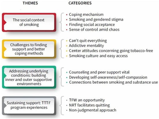 - Stewart, M.J.; Greaves, L.; Kushner, K.E.; Letourneau, N.L.; Spitzer, D.L.; Boscoe, M. Where There Is Smoke, There is Stress: Low-Income Women Identify Support Needs and Preferences for Smoking Reduction. Health Care Women Int. 2011, 32, 359–383. [Google Scholar] [CrossRef]
