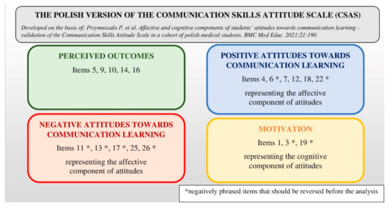 - Przymuszała, P.; Cerbin-Koczorowska, M.; Marciniak-Stępak, P.; Zielińska-Tomczak, Ł.; Piszczek, M.; Jasiński, J.; Marciniak, R. Affective and cognitive components of students’ attitudes towards communication learning—validation of the Communication Skills Attitude Scale in a cohort of polish medical students. BMC Med. Educ. 2021, 21, 190. [Google Scholar] [CrossRef] [PubMed]