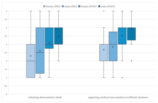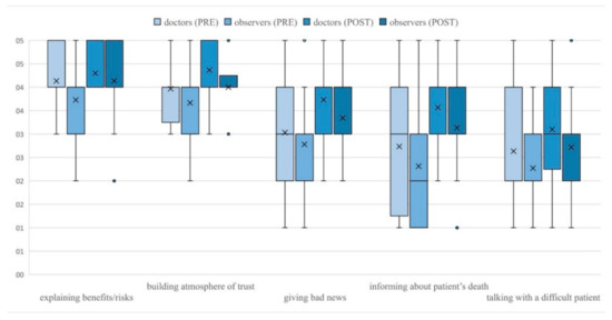 Students rated their communication skills after the course significantly higher in regard to nearly all skills (Table 2). After the intervention, male students rated significantly higher than females their ability to inform the family about patient’s death (p = 0.029) and support members of the medical team in difficult situations (p = 0.020) (Figure 2). No other gender differences in students’ self-efficacy ratings were observed before and after the study. Before the intervention, doctors gave significantly higher ratings than observers only to their ability to explain the benefits and risks of a given procedure (p = 0.019). After the course, the difference between both groups was no longer statistically significant (p = 0.424). After the study, doctors rated their abilities significantly higher than observers in respect to building the atmosphere of trust (p = 0.017), giving bad news to patients or family (p = 0.032), informing the family about the patient’s death (p = 0.014), and talking with a difficult, demanding patient (p = 0.049) (Figure 3). Despite these differences, the improvement of pre-post self-efficacy ratings among observers was still statistically significant—building the atmosphere of trust (p < 0.001), giving bad news to patients or their family (p < 0.001), informing the family about the patient’s death (p < 0.001) and talking with a difficult, demanding patient (p < 0.001). No other significant differences in ratings of doctors and observers were noticed.