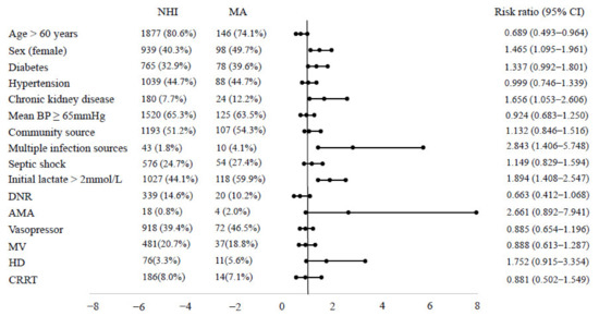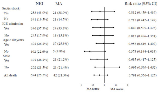 Patient characteristics of the full cohort dichotomized by health insurance status are summarized in Table 1 and Figure 2. Among the eligible population, 2329 patients (92.2%) were covered by NHI, and 197 patients (7.8%) were covered by MA. The MA group had fewer males (NHI vs. MA, 59.7% vs. 50.3%, p = 0.009), more chronic kidney disease (7.7% vs. 12.2%, p = 0.027), more multiple sources of infection (1.8% vs. 5.1%, p = 0.010), and more patients with initial lactate >2 mmol/L (44.1% vs. 59.9%, p < 0.001). However, survival outcomes were not different between the NHI and MA groups (Table 2). There were no significant differences in the proportions of patients who received organ support therapy and length of stay in the ICU or hospital between the two groups (Table 2). We also performed subgroup analysis by septic shock, ICU admission, age, and sex (Figure 3). The primary outcome was not different in all subgroups.