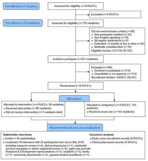 Process evaluations, often undertaken to understand why interventions are effective [10] and facilitate translation into practice [11], are particularly important for medication interventions in RACFs. Conducting empirical research in RACFs can present numerous challenges [12,13,14,15]. The medication management cycle in RACFs is complex and involves multiple stakeholders, and culture and processes can differ across RACFs, even those within the same organization. In Australian RACFs, which are similar to nursing homes and long-term care facilities, physicians and pharmacists are usually employed externally to the RACF, and staff administering medications may have good resident knowledge but might not be able to identify all simplification opportunities [16]. Residents of Australian RACFs are increasingly older and frailer, with complex multimorbidity and polypharmacy. Previous process evaluations of cluster RCTs of healthcare interventions suggest multiple facility, resident, staff, health professional and investigator-related factors can impact on recruitment and intervention delivery in RACFs [12,14,17,18]. These include organizational leadership, familiarity with research, trust, health literacy, attrition, resource availability and prioritization of other care activities, quality of information provided by study investigators, interprofessional communication, complexity of the intervention and mode of intervention delivery. It is therefore imperative to understand processes underpinning interventions to optimize medication management in RACFs. The aim of this process evaluation was to explore the processes underpinning the implementation and uptake of the medication simplification intervention in the SIMPLER study.