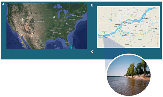 Study subjects were recruited from Buffalo Shores Beach, a twenty-five-acre recreation area downstream from Buffalo, Iowa, and about 10 miles southwest of the city of Davenport on the Mississippi River (Figure 1A). Multiple wastewater treatment plants (WWTPs) located upstream from the beach (Figure 1B,C) may contribute to beach contamination. However, the main source of pollution appears to be the city of Davenport because, as shown in Table 2, that city has largest capacity and coincidentally did not chlorinate their secondary effluent before discharging it into the Mississippi River.