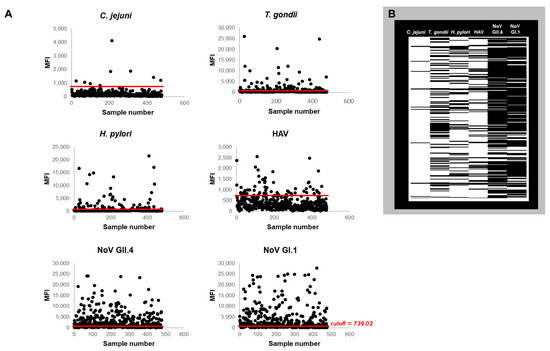 Immunoprevalence for targeted pathogens. (A) Median Fluorescence Intensity units (MFI) scatterplot showing all S1 samples with the cutoff (red line: 739.02 MFI) distinguishing positive (above) and negative (below) samples. (B) Immunoprevalence heatmap displaying the positive samples denoted by black lines.