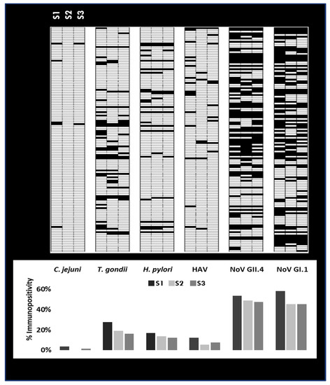 Immunopositivity summary: exposure status of the individuals who provided a saliva sample for each collection period (S1–S3). Upper panel: black lines represent the samples positive (MFI ≥ cutoff) for the targeted pathogens. Lower panel: % immunopositivity for the targeted pathogens.