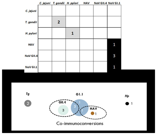 Immunoconversion summary denoting the number of immunoconversions and co-immunoconversions to the pathogens under study. Note Tg: T. gondii; GI.1: norovirus GI.1; GII.4: norovirus GII.4; HAV: hepatitis A virus and Hp: H. pylori.