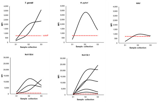 MFI curves for the pathogens under study. Plots showing IgG in MFI from S1 to S3 for immunoconversions. Red dashed line = cutoff (739.02 MFI).
