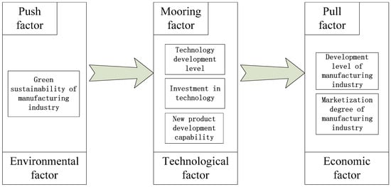 Combined with the relationship between theory and practice, this study investigated the influencing factors of the development of a regional AMI in the framework of PPM theory. The concept of an AMI is shown in Figure 1, where the mooring factor is in the internal development environment of the manufacturing industry. Technological development is inseparable from technological investment and new product design. Only with independent core technology can we effectively drive the intelligent development of an industry. Pull and push factors are in the external development environment of the manufacturing industry, such as economic and environmental factors. The economic effect of industrial agglomeration is to attract the arrival of advantageous industries. If the economic development level of a region is low, it is difficult to attract a large number of manufacturing enterprises to gather and produce a huge trading market. Environmental regulation can force unqualified industries to leave. It is necessary to implement ecological management and control for manufacturing enterprises to form rigid constraints on the ecological environment.