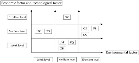 In Case 3, technology and the economy were at a medium level and the environment was weak, such as in HZ and ZS. Although the economic and technological development of HZ and ZS were slow, they were relatively stable. This shows that the development of these cities was insufficient, but they still had potential. However, their green development level was relatively unstable. The backward development of its environment indicates that there was still a large number of traditional industries that needed to be transformed and upgraded.