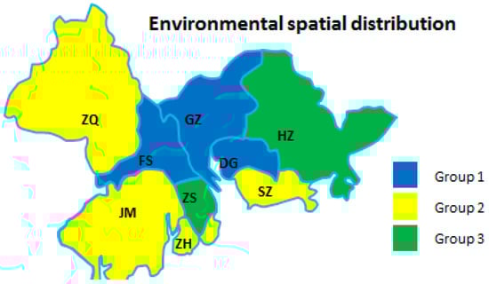 From the perspective of each dimension of the manufacturing industry in regional cities, the development degrees of different cities were obviously different. Therefore, it was necessary to divide urban groups using cluster analysis to find commonalities between urban development in different cities. As shown in Table 6 and Figure 3, Figure 4 and Figure 5, the sustainability of a regional AMI has three dimensions: economic, environmental, and technological factors. Due to the different emphases on industrial sustainable development in different cities, the spatial distribution of regional development factors was not the same. The results of the analysis are as follows.