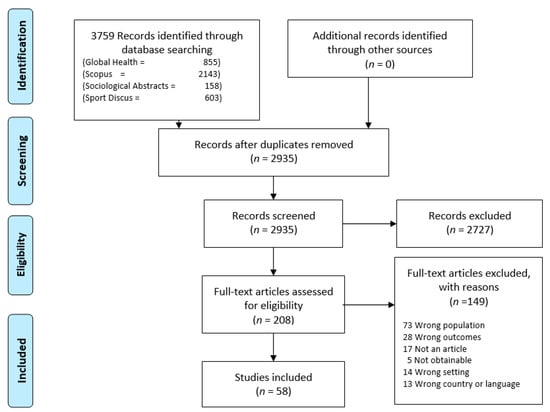 A total of 3759 references were identified in the four databases. After removing duplicates, 2935 went through title and abstract review, whereof 2727 were irrelevant. All three authors screened 50 articles together to internally validate the screening process, and subsequently they screened a third of the remaining 2727 references each. In case of disagreement, consensus was achieved between all three reviewers for full-text review. All in all, 208 studies were assessed for eligibility, of which 150 were excluded, with reasons. 58 articles were included for analysis and reviewed by two authors (see Figure 1).