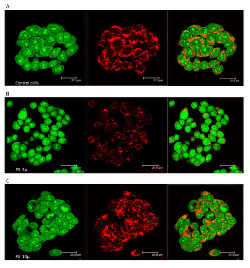 Membrane destabilization of the acidic vacuolar compartment in PS- MPs exposed cells. Images of acridine orange (AO)-loaded cells (400x magnifications) are reported: (A) Untreated cells showing intact lysosomes. (B,C) HT-29 treated with PS- MPs (800 p mL−1 for 24 h) 3 and 10 µ respectively. Diffuse green cytosolic fluorescence and the reduced number of red dots, in B images highlight the damage to late endosomes and lysosomes.