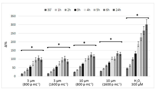Figure 2 reports the time course of ROS levels in cells exposed to 800 and 1600 p mL−1 PS-MP suspensions, expressed as the percentage change (Δ%) compared to control cells. Similarly, for the cell viability assessment, ROS production by PS-MP-exposed cells had moderate effects, especially when compared to that observed in the positive control (i.e., cells treated with 300 µM H2O2).