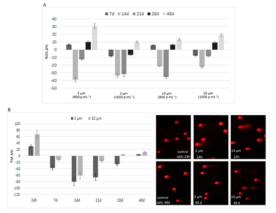 Effects of sub-chronic exposure in PS- MPs treated cells. (A) Δ % of ROS production in comparison to untreated cells after 7, 14, 21, 28, and 48 days. The graph highlights the ability of HT-29 to neutralize, albeit temporarily, the pro-oxidant effect of PS-MPs. (B). Results of Comet assay expressed as Δ % of tail moment ™ in comparison to untreated cells. Short-term treatment (24 h) caused a highly fragmented DNA in cells exposed to 3 and 10 µm PS-MPs (1600 p mL−1) which was suppressed in the intermediate time points and then only partially reappeared after prolonged exposure, showing the same trend of ROS production. On the right are shown representative images of Comet assay in control and PS-MPs treated cells after 24 h and 48 days.