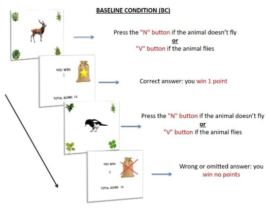 BC only included the ongoing task, for a total of 108 trials randomly presented. Participants were asked to perform a semantic decision task, pressing the “V” button, if an image of a flying animal appeared, and the “N” button if an image of a non-flying animal appeared (Figure 1). Participants received 1 reward point (RP) for every correct answer and no RP for any wrong or omitted answer.