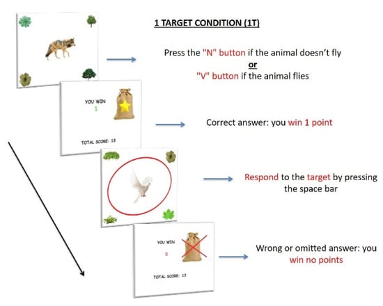 Procedure of 1 Target condition (1T). The items consisted of 120 images of an animal located at the center of the screen; images of plants were located at the four corners of the screen. As in the BC, participants had to press the “N” button when the image of a non-flying animal appeared on the screen and the “V” button when the image of a flying animal appeared on the screen (ongoing task). However, when a dove—PM target—appeared on the center of the screen (12 trials), participants were required to press the spacebar (PM task), instead of the semantic decision task. Each stimulus appeared for 2 s. They received 1 RP for every correct answer and no RP for any wrong or omitted answer, in both tasks (ongoing and PM trials).