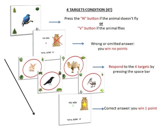 Procedure of 4 Targets condition (4T). The items consisted of 120 images of an animal located at the center of the screen; images of plants were located at the four corners of the screen. As in the BC, participants had to press the “N” button when the image of a non-flying animal appeared on the screen and the “V” button when the image of a flying animal appeared on the screen (ongoing task). However, when one of the four PM targets (rabbit, crow, camel, pelican) appeared at the center of the screen (12 trials), participants were required to press the spacebar (PM task), instead of the semantic decision task. Each stimulus appeared for 2 s. They received 1 RP for every correct answer and no RP for any wrong or omitted answer, in both tasks (ongoing and PM trials).