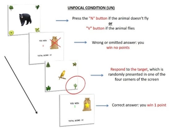 Procedure of Unfocal condition (UN). The items consisted of 120 images of an animal located at the center of the screen; images of plants were located at the four corners of the screen. As in the BC, participants had to press the “N” button when the image of a non-flying animal appeared on the screen and the “V” button when the image of a flying animal appeared on the center of the screen (ongoing task). However, when the cactus plant—Prospective target—appeared in one of the four corners of the screen (12 trials), participants were required to press the spacebar (PM task), instead of the semantic decision task. Each stimulus appeared for 2 s. They received 1 RP for every correct answer and no RP for any wrong or omitted answer, in both tasks (ongoing and PM trials).