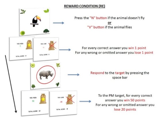 Another element to take into account when studying PM performances of children with ADHD is the reward amount. Individuals with ADHD exhibit an alteration of reward mechanisms, resulting in an aberrant sensitivity to reinforcement []. These alterations have been linked to the concept of delay aversion, which indicates the preference for small immediate rewards over large, delayed rewards [,]. Thus, it is conceivable that the number of rewards has a role in modulating PM performances of children with ADHD: in particular, an increased amount of reward should positively affect their performances. However, this hypothesis has never been tested in PM tasks.