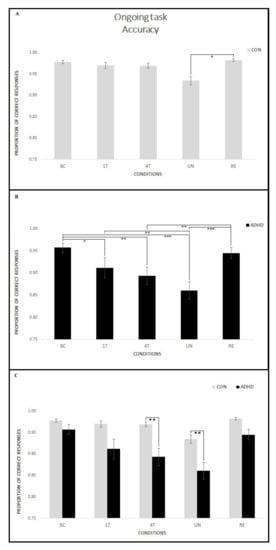 Accuracy on the ongoing task for each condition in the two groups. Within-group comparisons showed that in the CON group (A) no significant difference emerged between BC and all the PM conditions; the accuracy on the UN was lower than the RE condition. Conversely, participants in the ADHD group (B) showed lower accuracy in almost all the PM conditions compared to BC. 4T and UN conditions were lower than 1T and RE. Between-group comparisons (C) showed that the ADHD group performed significantly lower than the CON group on the 4T and UN conditions, while no difference emerged on the BC, 1T, and RE conditions. Asterisks mark significant differences: * p < 0.05, ** p < 0.01, *** p < 0.001.