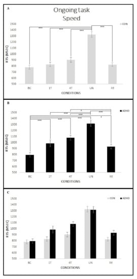 Ongoing task speed for each condition in the two groups. Within-groups differences emerged in the mean response RTs (see A,B), but no significant differences occurred between groups (C). In the CON group (A), no difference emerged between the mean response RTs in the BC and almost all PM conditions (1T, 4T, RE), with the exception of the UN, in which they were slower than all other conditions. In the ADHD group (B), participants were slower in all PM conditions compared to BC; moreover, as in the CON group, on the UN they were slower than all other conditions. Finally, the mean response RTs on the 4T was slower than the RE condition. Asterisks mark significant differences: * p < 0.05, *** p < 0.001.