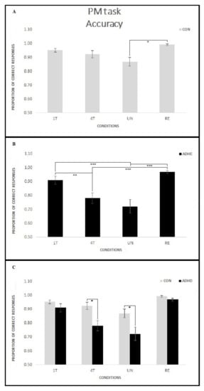 Accuracy on the PM trials for each PM condition in the two groups. Participants in the CON group showed no significant differences between conditions, with the exception of the UN, lower than the RE condition (A). Conversely, participants in the ADHD group showed lower accuracy on the 4T and UN conditions compared to 1T and RE (B). Moreover, differences between groups emerged because the ADHD group performed significantly lower than the CON group on the 4T and UN conditions (C). Asterisks mark significant differences: * p < 0.05, ** p < 0.01, *** p < 0.001.