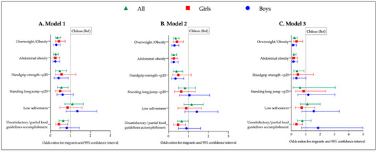 In relation to low handgrip strength (<p25) lower odds in the general sample for migrants in all models were observed when compared to Chileans (p < 0.05). When stratified by sex, this trend remained significant in Model 2 only for boys, but when adjusted by time of migration (Model 3), significance was lost. Low standing long jump (<p25) was significant just in the univariate model for the general sample (OR: 0.55; CI: 0.35–0.89). Low self-esteem was not significantly associated to nationality or sex in any model. Unsatisfactory food guidelines accomplishment presented lower odds in migrants for the general sample (Models 1 and 2). In the analyses by sex significance is only observed in girls (Models 1 and 2).