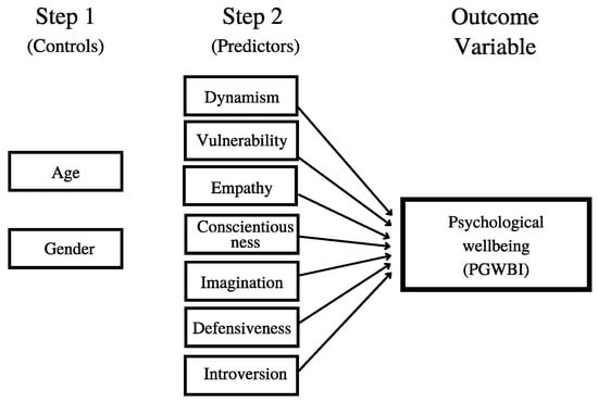 As shown, neither gender nor age affected the results. The vulnerability trait negatively affected the PGWBI total score (β = −0.62), anxiety (β = −0.55), depression (β = −0.46), positivity and wellbeing (β = −0.51), vitality (β = −0.45), general health (β = −0.12) and self-control (β = −0.52). Dynamism as a trait positively influenced vitality (β = 0.12) and positivity and wellbeing (β = 0.14). Despite the differences between genders (Table 5) and ages (Table 6) in the sample, gender and age were not influential predictors of psychological health.