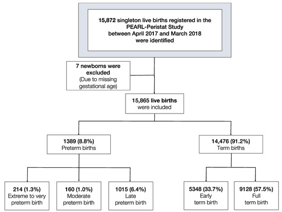 A total of 15,872 singleton live births registered in the PEARL database from April 2017 to March 2018 were identified, of which 15,865 singleton live births were examined (Figure 1, Table S1).