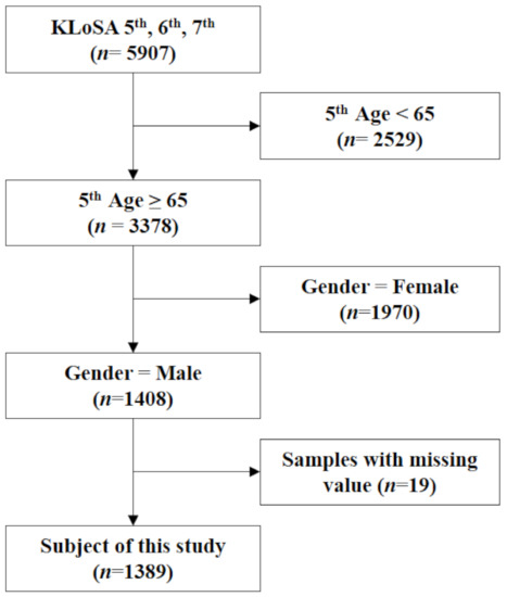 Korean Longitudinal Study of Aging (KLoSA) is a panel survey conducted by the Korean Labor Institute and the Korea Employment Institute Information Service [23]. The survey began in 2006 to produce basic data that establish and enforce effective socioeconomic policies. The first survey was conducted with 10,254 people from 6171 households. Since then, a survey has been conducted every 2 years. The fifth survey was conducted in 2014, the sixth in 2016, and the seventh in 2018. For this study, we selected 5907 people who participated in the fifth, sixth, and seventh KLoSA. Among them, 1389 men were included, excluding people with the following conditions: under the age of 65 years (n = 2529), women (n = 1970), or lacking data (n = 19). As of 2014, the average age of the survey group was 73.26 ± 5.95 (Figure 1).