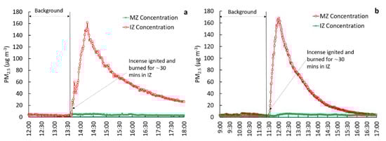 Figure 1 shows that the background concentrations in both IZ and MZ were very low (mean < 5 µg·m−3). After the incense ignition, which burned for ~30–35 min, PM2.5 concentrations increased rapidly in the IZ, reaching a maximum concentration of ~160 µg·m−3. In the absence of any intervention such as an exhaust and/or window ventilation, the observed decay in concentrations in the IZ was attributed to loss due to particle deposition on surfaces within the IZ room as well as a small amount of naturally induced infiltration from internal air buoyancy (the wind).