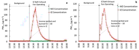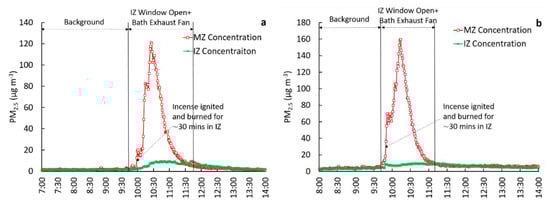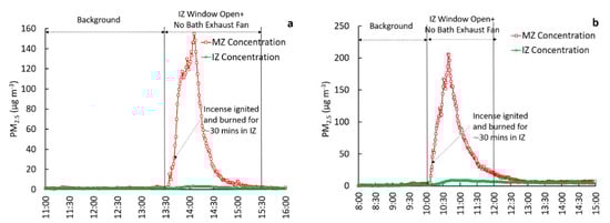 This test configuration involved operating the bathroom exhaust fan while keeping one window in the IZ open. Three trials were performed under this configuration. The concentration time series for two such experiments are shown in Figure 4. For the background periods, concentrations in the IZ and MZ were very low and identical. However, concentrations in the MZ increased while the incense was emitting PM2.5 in the IZ, and the exhaust fan was operational with the IZ window open.