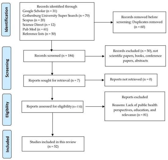This review was conducted in accordance with the Preferred Reporting Items for Systematic Reviews and Meta-Analyses (PRISMA) guidelines and its flow diagram []. The searching process included articles and the PRISMA checklist for each considered study and abstract were completed and attached to this manuscript (Appendix A, Appendix B and Appendix C). The scientific evidence of each selected article was assessed, by using the Health Evidence Quality Assessment Tool (Appendix D), as Strong, Medium, and Weak []. Initially, Google Scholar was used as the testbed to estimate the number of hits and adjust the searching keywords accordingly. In the next step, Science Direct, Scopus, PubMed, and Gothenburg University’s Super search engines were used for a systematic search. The inclusions criteria were original research studies published in English. The exclusion criteria were conference papers, abstracts, reports, and non-scientific publications.