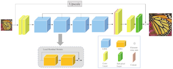 - Tong, T.; Li, G.; Liu, X.; Gao, Q. Image super-resolution using dense skip connections. In Proceedings of the IEEE Conference on Computer Vision and Pattern Recognition Workshops, Honolulu, HI, USA, 21–26 July 2017; pp. 4799–4807. [Google Scholar]