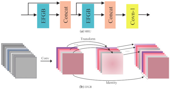where indicates the s-th EFGB of first SIRU in the k-th LRM, the denotes the convolution layer used for compression. represents the refined information of s-th stage, which is the concatenation along channel dimension of the input and output of , and the is the output of SIRU. Similarly, we can get the . The final output of k-th LRM can be obtained by