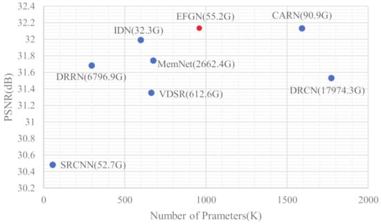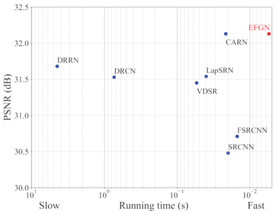 Figure 4 shows the relationship of model complexity and reconstruction performance, from which we can observe that the EFGN can achieve a trade-off between the model complexity and reconstruction performance. It should be declared that we represent the computational costs by multiply-accumulate operations (MAC) and when calculating MAC the SR image is assumed to be 720P (). Furthermore, we also test the running time of some typical CNN-based SR methods. To be fair, all of the methods are tested on an NVIDIA 1080Ti GPU. The results are shown in Figure 5. It’s obviously that our proposed EFGN has the fastest running time (0.0055 s) while keeping high performance, which indicate the theoretical feasibility of applying the EFGN to real time monitoring.