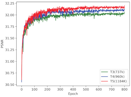 To find a proper parameter setting, we fix the input channel of first EFGB in SIRU as 64 and T as 4. Then we divide the model to three types according to the output of EFGB in SIRU. Concretely, the output channel of EFGB in expansion model is increased by 32. On the contrary, the reduction model reduces the output channel of EFGB by 32 while the basic model maintains the number of output channel as the same of input channel. The experiment results are presented in Table 2. EFGN_B is the basic model. EFGN_S and EFGN_L are the reduction model and expansion model, respectively. We can see that model with larger output channel numbers shows better performance. Meanwhile, the model size has also increased. The improvement between the EFGN_S and EFGN_B is significant (PSNR: +0.13 dB, Parameters: +496 K). In contrast, the performance improvement brought by parameter increase between EFGN_B and EFGN_L (PSNR: +0.05 dB, Parameters: +643 K) is less cost-effective. So, the setting of EFGN_B is chosen for further experiments.