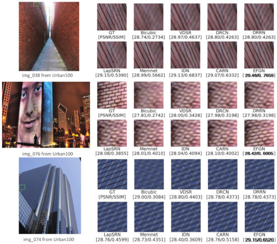 The qualitative evaluation is carried out by comparing the reconstructed SR images visually. Some results are shown in Figure 9. In “img_038”, the image obtained by our proposed EFGN is close to the GT images but the other methods have failed to recover the sharp lines. In the results of “img_076”, all the previous methods reconstruct the details of image in wrong direction while our method recover the clear and correct textures. For the result of “img_074”, the images obtained by other methods are suffering from distortion and blurriness while our EFGN can recover a more faithful image. That further indicates the effectiveness of EFGN.
