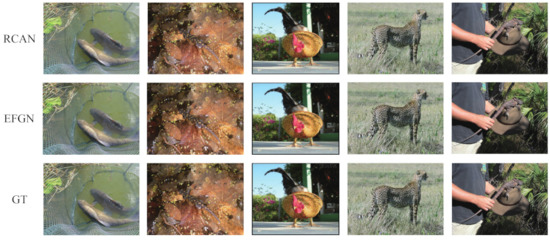 The LR training images are downsampled from their HR counterparts with bicubic interpolation. We crop the image patches with a size of from LR training images as the input. In each training iteration, 16 LR image patches are sent to the network. To further improve the generalization ability of our models, we carry out data argumentation on the image patches with random horizontal flips and rotations. The Adam optimizer [34] is applied to train our networks, the hyper-parameters and are set as 0.9 and 0.999 respectively. We use as the initial learning rate and halve it every training iterations. The total training iterations are . The whole training process are implemented on an NVIDIA 2080Ti GPU by Pytorch framework. The code is available at https://github.com/gokuson77/EFGN (accessed on 17 May 2021).