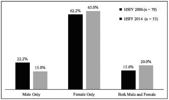 The overwhelming majority of sexually exploited boys (77.8% and 85%) reported they were exploited by women in both the 2006 and 2014 surveys (see Figure 1). Of boys who were sexually exploited by women, 62%–65% were exploited by women only, while 15%–20% reported being exploited by both men and women. Men were identified as the only perpetrator by 15%–22% of boys; these percentages were not significantly different between years. With the one-way ANOVA comparing the experiences of sexual exploitation by age of sexually exploited boys, age they first traded sex, and gender of perpetrators, there was a significant effect of the age of boys who were sexually exploited and the gender of perpetrator (males only, female only and both male and female) at p < 0.05 for the three conditions (F (2, 62) = 3.178, p = 0.049). Post hoc analyses using Tukey’s Honestly Significant Difference indicated that boys who reported being sexually exploited by females only were older on average (M = 16.41) than those who said they were exploited by both male and females (M = 15.09). No differences were noted between gender of perpetrators and the age at which boys first traded sex.